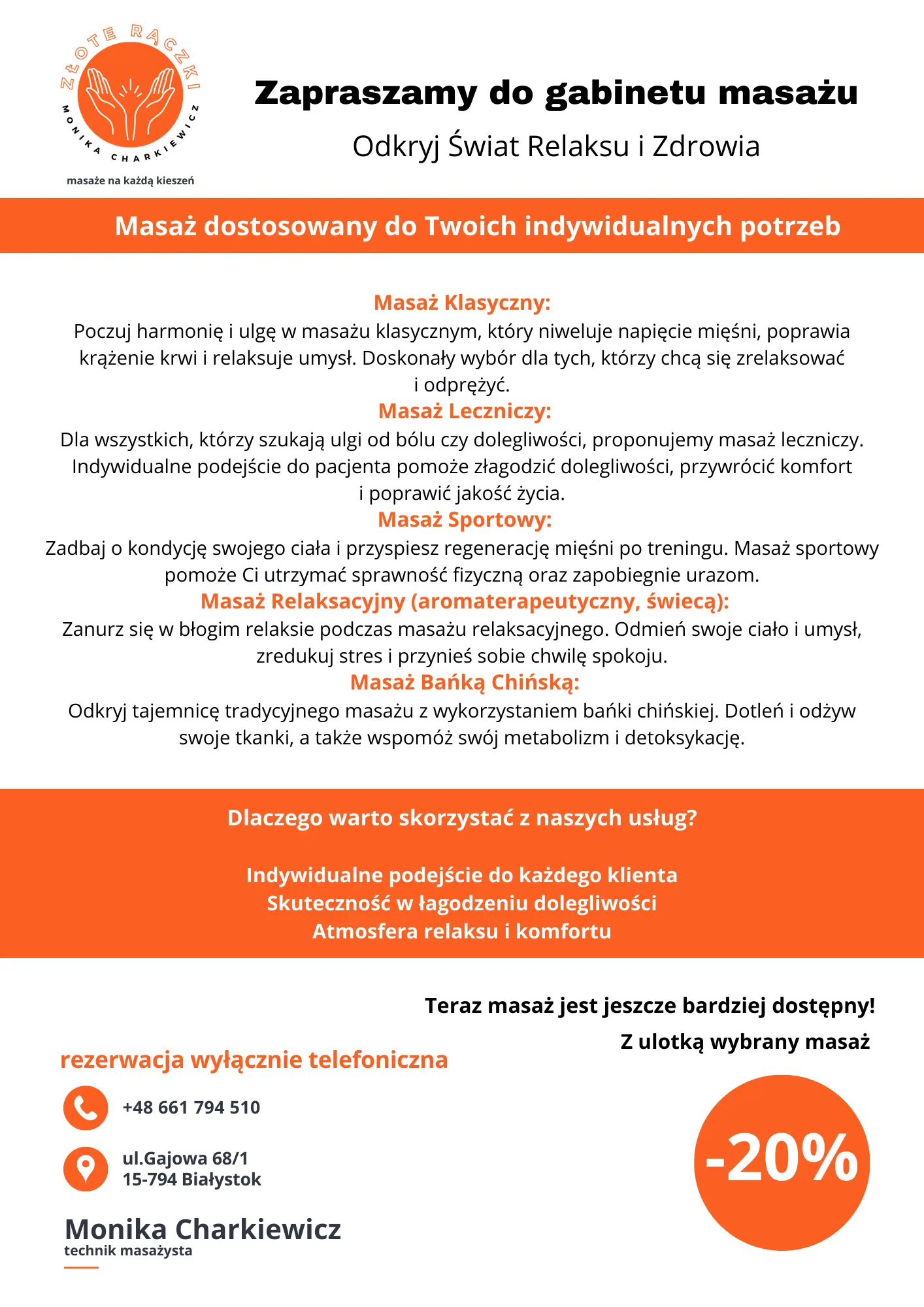 - Treść ulotki promocyjnej nowego gabinetu masażu: